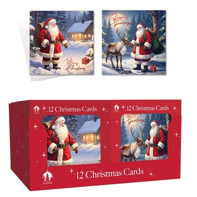 12 XMAS Cards, Boxed Santa, Reindeer, Night